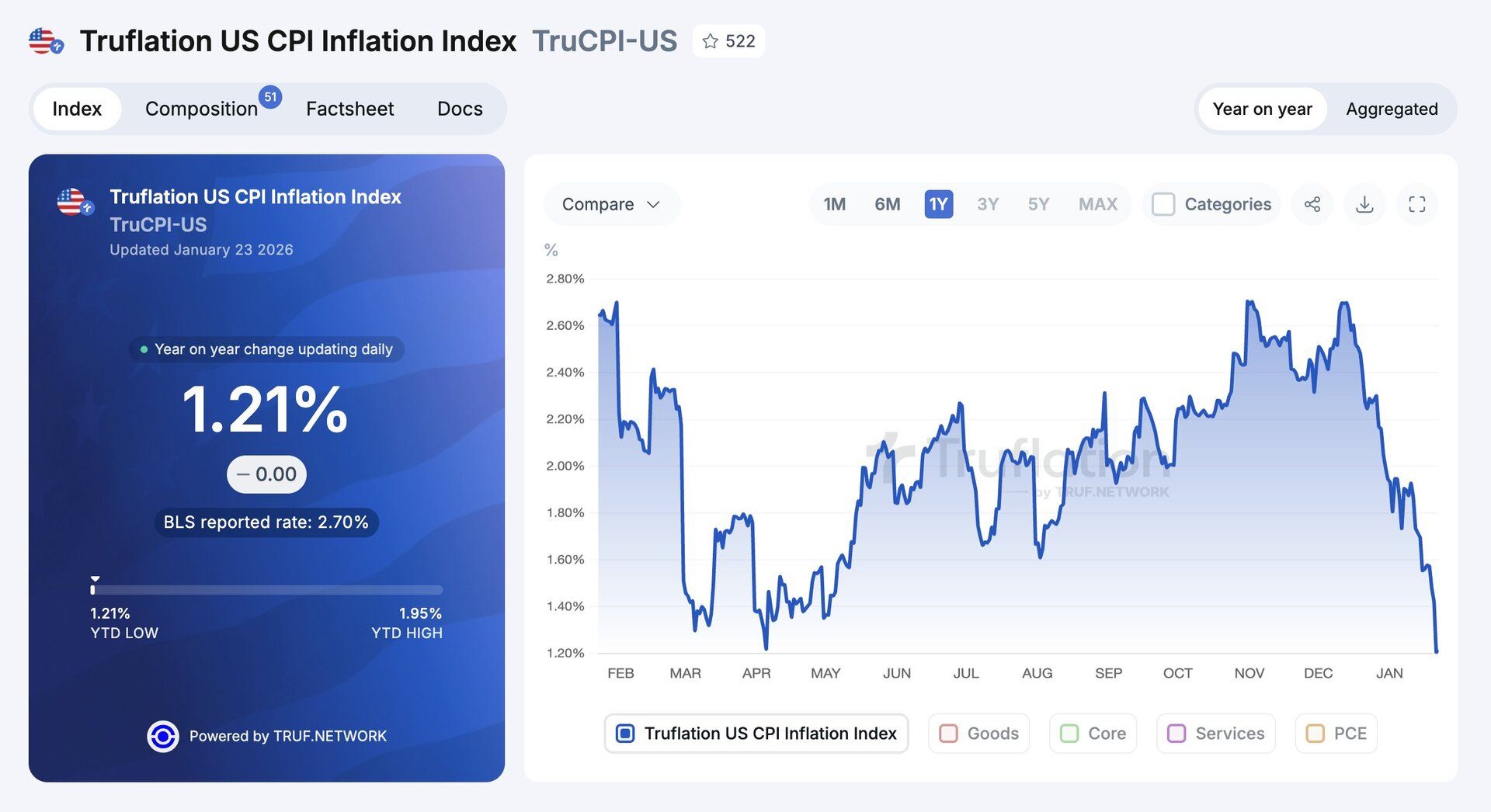 Truflation, on the other hand, is a newer, private, real-time inflation tracker that scrapes millions of actual price points from online sources every day instead of waiting on monthly surveys. Because of that, its numbers tend to move faster and sometimes tell a different story than the official CPI.