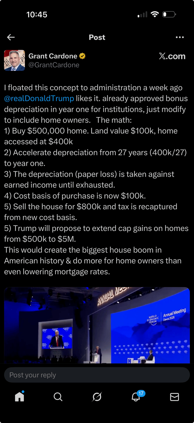On X this past week, Grant Cardone proposed a plan to approve bonus depreciation for owner-occupied properties instead of keeping that strictly for investors.