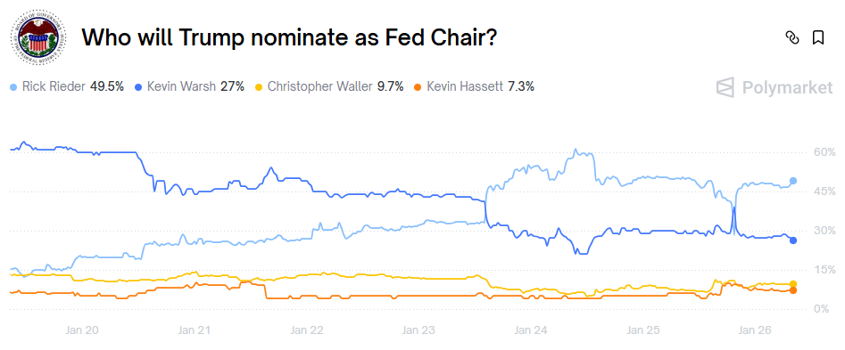 Additionally, the candidate for the next Federal Reserve chair took a major turn. It was down to the “Two Kevins” for a while. But within the last week, Rick Rieder of Blackrock fame, has pulled ahead to almost 50% odds on Polymarket (up from 3%).